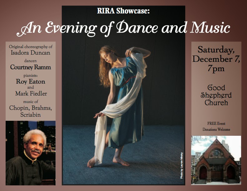 The next performance I am super excited about is "An Evening of Dance and Music", a solo performance of solos choreographed by Isadora Duncan, the mother of modern dance in America. There will be live piano (music of Brahams, Chopin, and Scriabin) by acclaimed pianists Roy Eaton and Mark Fiedler.